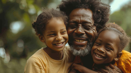 Elderly man with grey hair and beard, embracing two younger boys, all smiling and close together, representing family and generations. With Generative AI technology.