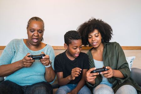 Portrait of African American grandmother, mother and son playing video games together at home. Technology and lifestyle concept.