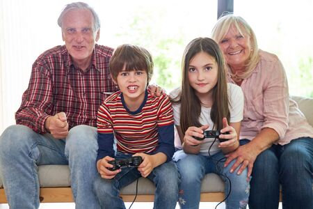 Kids with game console playing video game together with grandparents