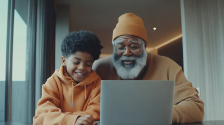 Elderly man with a gray beard and young boy with curly hair are sharing a moment while looking at a laptop screen, fostering connection and learning together