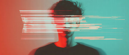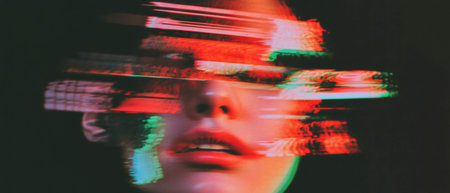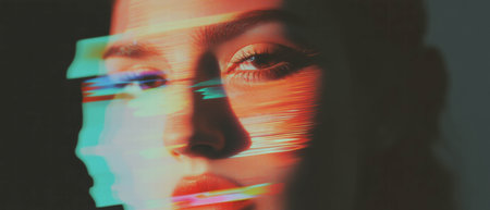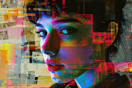 Glitch effect creates a distorted portrait with vibrant colors and sharp contrasts