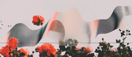 Minimalist collage blending geometric shapes with floral elements and audio waveform design