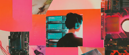 Minimalistic mixed media collage showcasing technology and vibrant textures in harmonious design