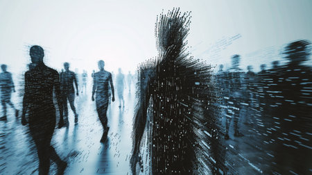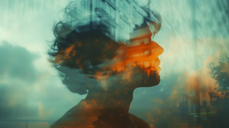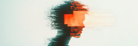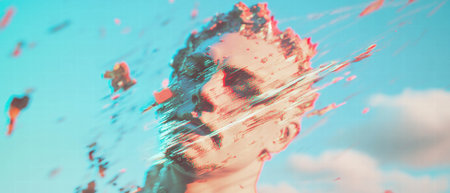Pixelated human profile silhouette fragmenting, visualizing digital disruption, technological interference, and psychological fragmentation through glitchy distortion effects