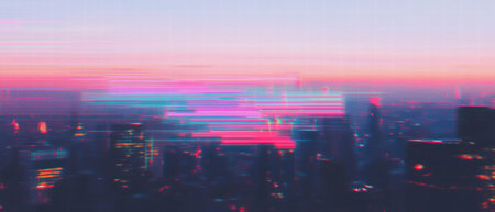 Glitch effect creates vibrant blocks and distorted patterns in urban skyline