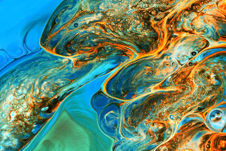 Abstract background of acrylic paints in orange and blue color tones