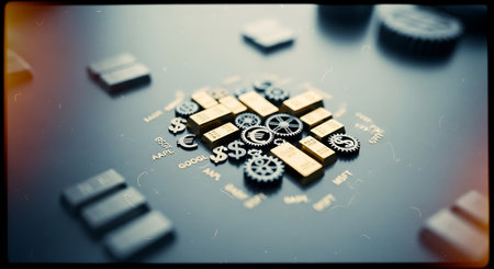 A detailed close-up of mechanical gears and colorful blocks arranged on a circuit board, creating a futuristic and technological mood.