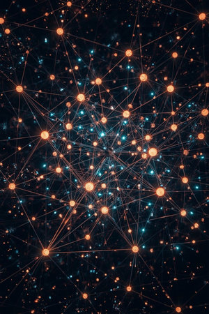 Stylized digital illustration of a complex neural network with glowing spheres and connecting lines on a dark background. Represents artificial intelligence, data science, and digital communication systems. Ideal for tech, innovation, and machine learning themes.