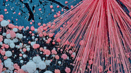 Close-up view of delicate pink and white spheres with fine, radiating strands against a dark, textured background.