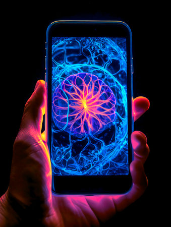 Bright rainbow rays reflect in mobile phone screen surface with dark blurred background. Multicolored beams and reflection in smartphone screen closeup
