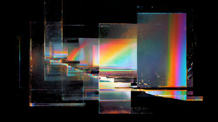 abstract digital glitch art texture featuring vibrant rainbow-pink light leaks, geometric distortions, and static noise on a black background. Generative AI