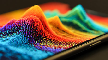 A stunning display of multi-layered, glowing digital waves cascades across a modern screen, blending vivid hues, fine pixel intricacies, and lively illumination in a