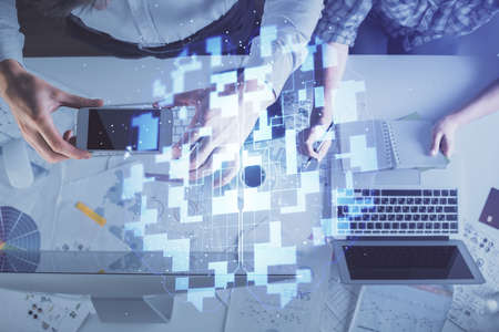 Double exposure of man and woman working together and data theme hologram drawing. Computer background. Top View.