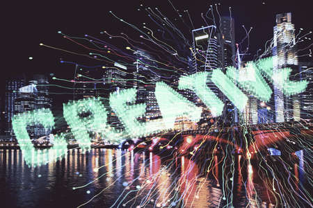 Double exposure of start up theme drawings over cityscape background. Concept of success.