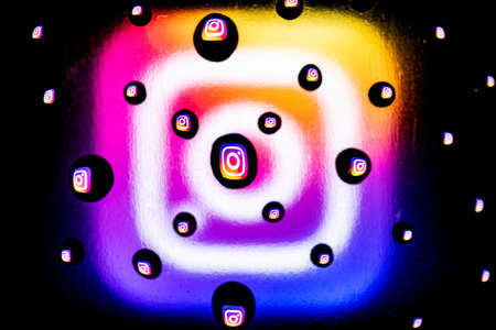 Kazan, Russia - Oct 21, 2021: of the social network Instagram is reflected by water drops.