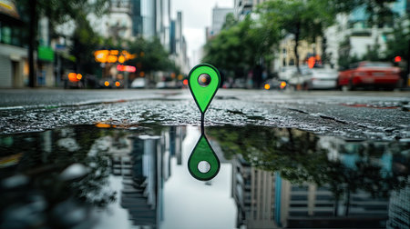 A vibrant green location pin standing in a city puddle, reflecting urban buildings with a hint of greenery. A thought-provoking visual capturing urban dynamics.