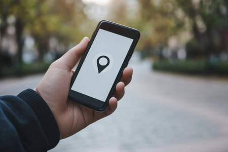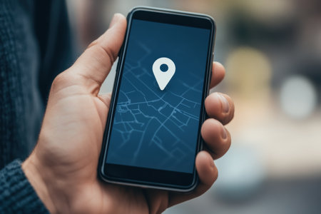A male hand grips a mobile phone with a location pin visible on the screen, indicating navigation in an urban environment.