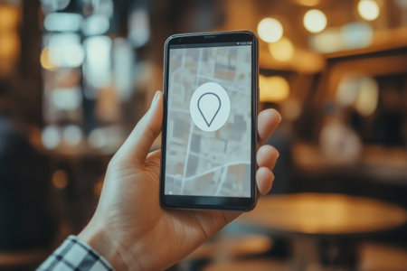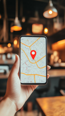 A hand holds a smartphone showing a location pin on a map, highlighting navigation while surrounded by a lively caf