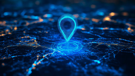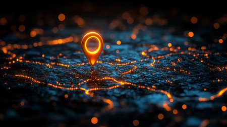 glowing gps pin on digital map, night view. futuristic navigation and technology concept