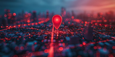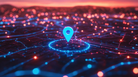 High-tech digital map with a glowing red location pin, highlighting navigation and location services. High quality photo