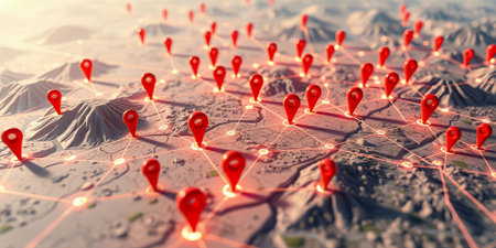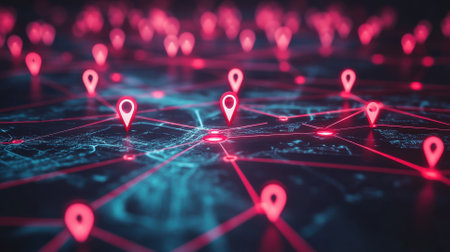 A futuristic digital grid with glowing blue lines connecting numerous red location pins, creating a sense of interconnectedness and data flow.