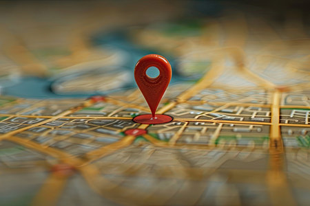 Red location pin on a map, symbolizing travel destination or navigation concept.