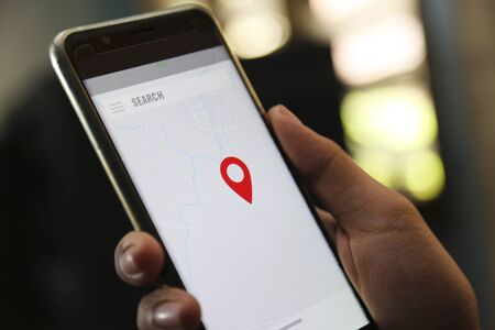 A female's hand holds a smartphone with an online maps app. Point location. Close up. Outdoor. GPS concept and internet guide of travel.