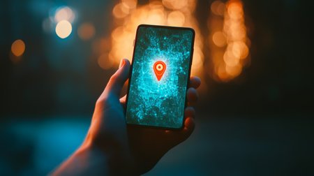 Hand holding a smartphone displaying a gps location pin on a map with a blurred city lights background at night, symbolizing navigation and location services