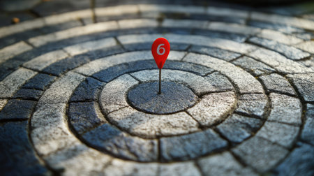 A vivid red location pin stands prominently at the center of a stone spiral pathway, representing point number six, inviting exploration and curiosity.
