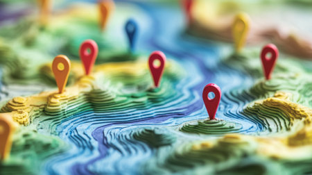 A vibrant three-dimensional map showcasing various landforms adorned with colorful pins, symbolizing key locations for navigation and exploration. Perfect for travel and geography themes.