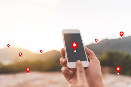 Man hand using smart phone on top of mountain with navigator location point abstract background. Technology business and travel adventure concept. Vintage tone filter effect color style.