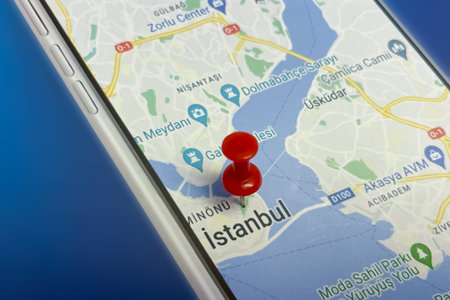 istanbul,Turkey.April 26,2023.Close-up of a map with a red pushpin on a smartphone.Location Istanbul, Turkey.