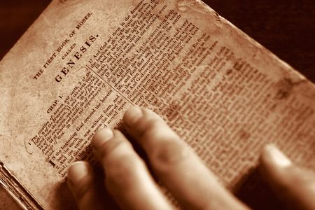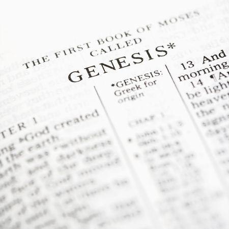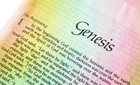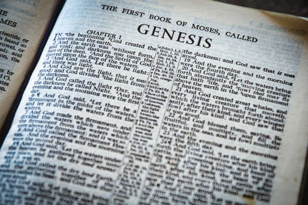 Close up of Holy Bible page, shallow depth of field with focus on book chapter, heading, Genesis