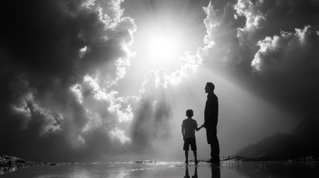 A man and a child are looking up at the stars. The man is holding the child's hand