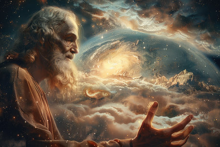 An elder with long white hair and a beard gazes thoughtfully into the cosmos, embodying wisdom and peace.