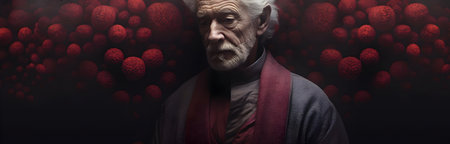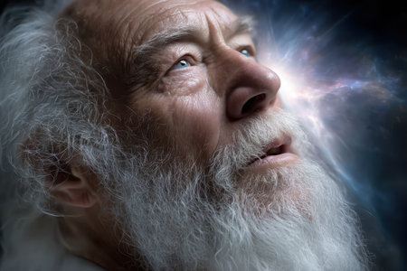 An elderly man with a long white beard gazes up, pondering the universe with a serene expression.