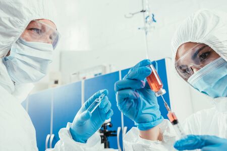 biochemist taking medicine with syringe while colleague holding ampule