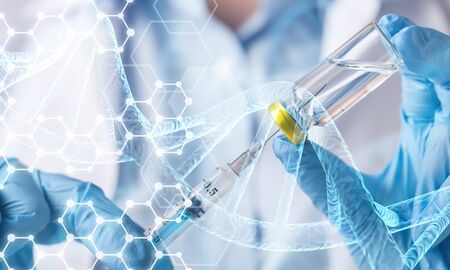 DNA helix research. Concept of genetic experiments on human biological code DNA. The scientist is holding DNA helix and syringe