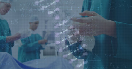 Image of dna strand spinning over diverse suergeons. Global medicine, connections, computing and data processing concept digitally generated image.