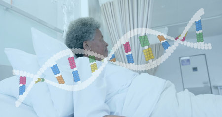 Image of dna strand over senior biracial female patient in hospital bed. Medicine, health and digital interface concept, digitally generated image.