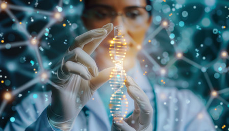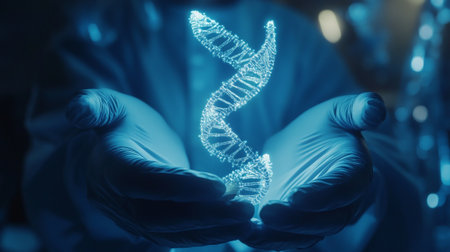 Scientist wearing a lab coat and gloves holding a glowing dna double helix model in a genetics research lab
