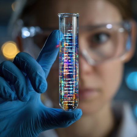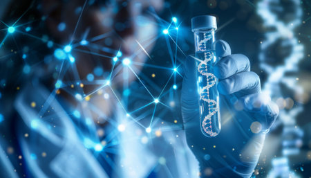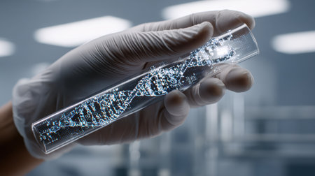 A hand in a sterile glove holds a transparent test tube featuring a digital representation of a DNA helix, symbolizing scientific discovery and innovation in a modern laboratory environment.