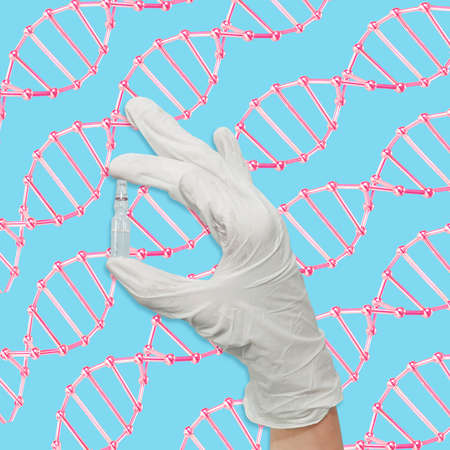 DNA molecules design with female hand holding pincers. Mixed media