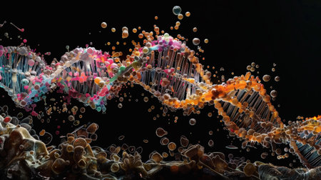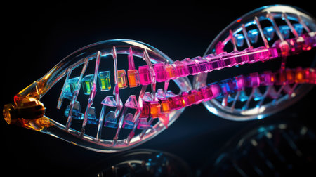 Stunning digital representation of a DNA helix showcasing intricate details and vibrant colors, set against a dark background for scientific use.