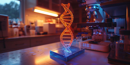 dna helix model surrounded by lab equipment, created with generative ai