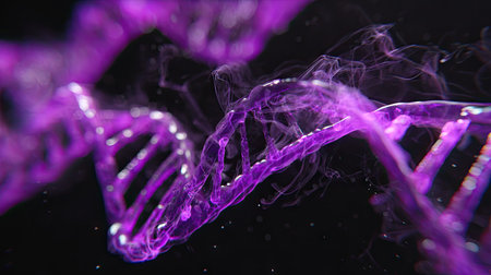 An artistic rendering showcases a glowing purple DNA strand against a dark backdrop. The image utilizes selective focus, creating a blurred effect in the background while highlighting the central subject. This illustrative piece could be suitable for educational, scientific, or conceptual projects, offering versatility in various media applications.