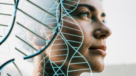 A thoughtful human face with intricate molecular structures gently overlaying the skin representing the complexities of gene therapy at a cellular level..