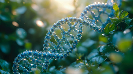 A sparkling blue DNA strand intertwined with lush green leaves, representing the connection between genetics and nature.