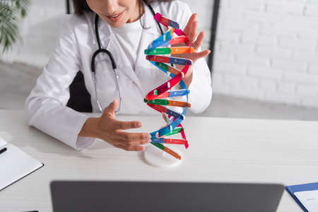 Cropped view of doctor holding dna model during online consultation on laptop in clinic