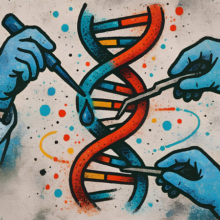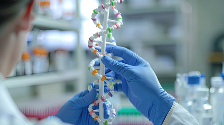 Researcher wearing gloves, holding a DNA strand model, symbolizing advancements in genetic technology